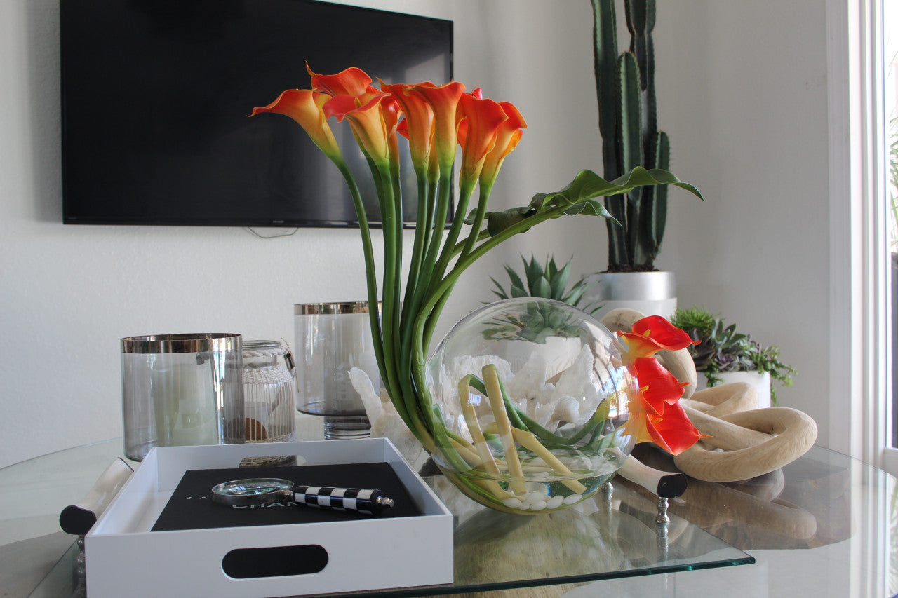 Crosswinds vase 12″ x 11″ with beautifully arched mango calla lilies and leaves. white stones and our illusion water.